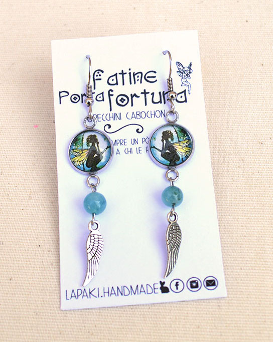 Vengono spediti con il cartoncino di supporto in un sacchetto di organza, completi dei ferma-orecchini già applicati sul retro della monachella