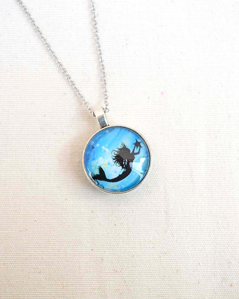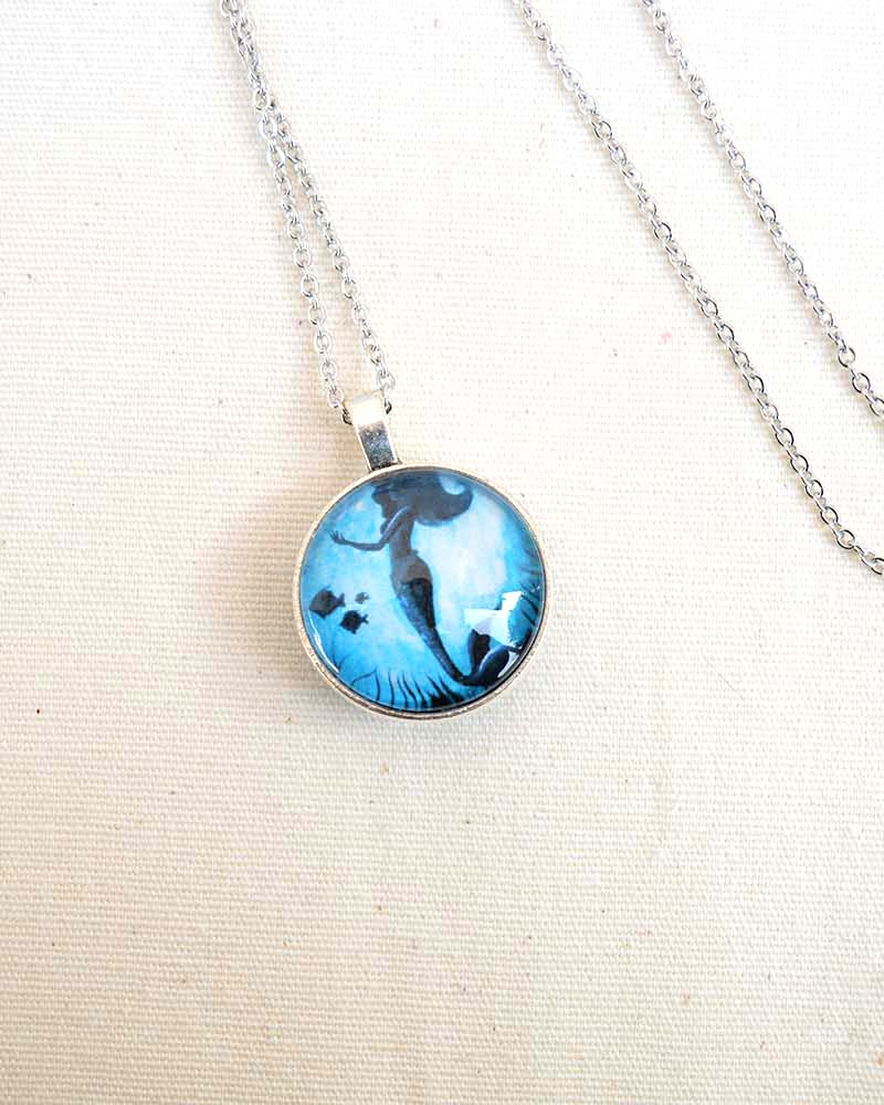 Collana con illustrazione a tema Sirene Medaglione a cabochon con stampa fronte retro e copertura in vetro Catenina in acciaio anallergico lunga 80 cm (non ossida ed è resistente agli agenti aggressivi, perciò può essere indossata sempre) Chiusura fissa con moschettone a semino Spedita nel suo sacchettino in organza con cartellino dedicato MATERIALI: catenina in acciaio lunga (80 cm circa) chiusura fissa con moschettone medaglione a cabochon con stampa fronte e retro copertura in vetro
