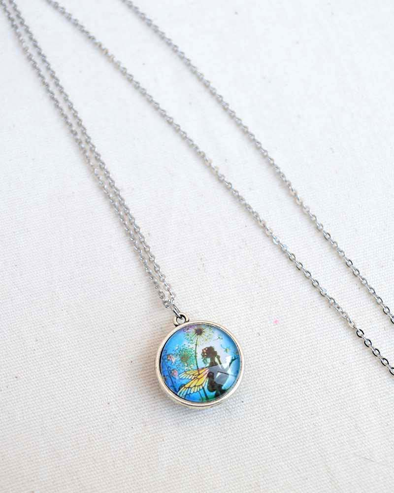 Collana con illustrazioni a tema Fatato Medaglione a cabochon con stampa fronte retro e copertura in vetro Catenina in acciaio anallergico lunga 80 cm (non ossida ed è resistente agli agenti aggressivi, perciò può essere indossata sempre) Chiusura fissa con moschettone a semino Spedita nel suo sacchettino in organza con cartellino dedicato MATERIALI: catenina in acciaio lunga (80 cm circa) chiusura fissa con moschettone medaglione a cabochon con stampa fronte e retro copertura in vetro