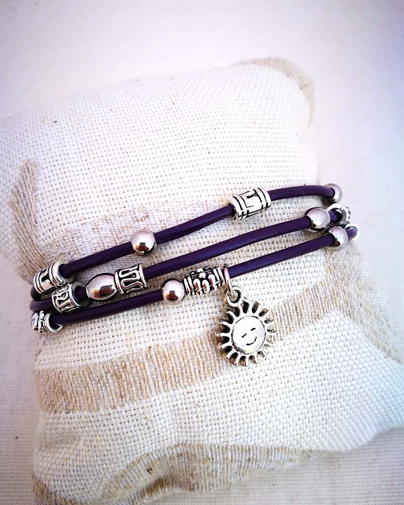 Luna In molte culture rappresenta la femminilità; è simbolo di fertilità, intuizione, libertà. E’ collegata con i ricordi profondi: come regola le maree, regola anche tutte quelle sensazioni che ci toccano in modo indelebile. Il ciclo lunare, invece, simboleggia l’immortalità, il continuo rinnovarsi accrescendo le esperienze. Braccialetto in pelle a due giri. Viene indossato facendo due giri del polso e scegliendo la misura giusta con la catenella di regolazione. Colore ciclamino metallizzato, è composto da tre cordini tondi da 1,5 mm. Le perline scorrono sul filo e sono lavorate in rame placcato nickel free. Regolabile a misura con il moschettone e la catenella. Ciondolo in rame placcato nickel free. Accompagnato dal suo cartoncino con la spiegazione del simbolo. Se ti piace il modello ma preferiresti un altro ciondolo, sceglilo dal menù a tendina! MATERIALI cordino in pelle ciclamino metallizzato perline in rame placcato nickel free chiusura regolabile con catenella e moschettone charm in rame placcato nickel free
