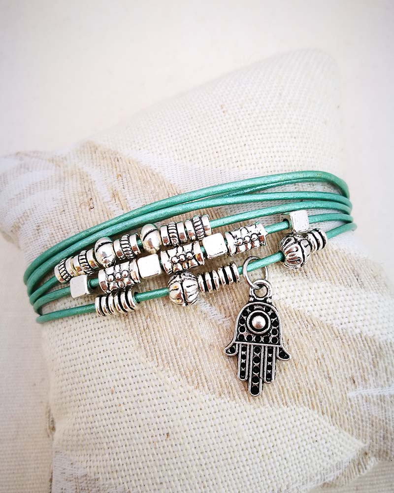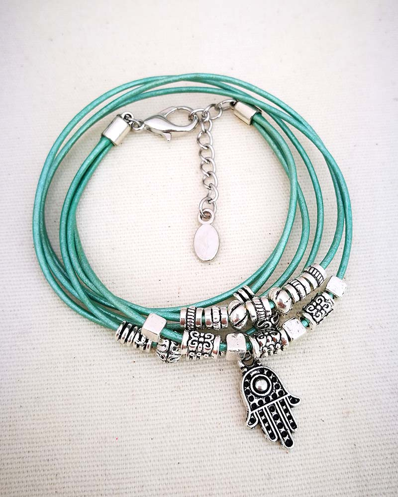 Mano di Fatima Protegge da tutti gli influssi negativi. Dona equilibrio ed armonia. Braccialetto in pelle ad un giro Colore azzurro, è composto da tre cordini tondi da 2 mm. Le perline scorrono sul filo e sono lavorate in rame placcato e acciaio. Regolabile a misura con il moschettone e la catenella. Ciondolo in rame placcato nickel free Accompagnato dal suo cartoncino con la spiegazione del simbolo. Se ti piace il modello ma preferiresti un altro ciondolo, sceglilo dal menù a tendina! MATERIALI cordino in pelle azzurro perline in rame placcato nickel free e acciaio chiusura regolabile con catenella e moschettone charm in rame placcato nickel free