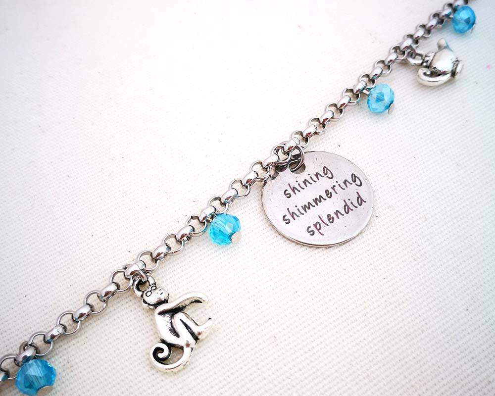 Peter Pan Never Grow up - Non crescere mai Think Happy thoughts - Fai pensieri felici Second star to the right - Seconda stella a destra Off to Neverland - Verso l'isola che non c'è Braccialetto a tema Disney con medaglietta in acciaio stampato Catena centrale in acciaio anallergico (non ossida ed è resistente agli agenti aggressivi, perciò può essere indossata sempre) Chiusura regolabile con moschettone in acciaio Ciondoli in rame placcato, nickel free (non consiglio di metterli a contatto con prodotti troppo aggressivi: detersivi, profumi, saponi, acqua di mare o acqua della piscina perchè, a lungo andare, potrebbero scalfirne l'argentatura) Perline in cristallo Spedita in un sacchino di organza con cartellino dedicato MATERIALI: catena centrale in acciaio chiusura regolabile con moschettone in acciaio medaglietta in acciaio con frase stampata a tema ciondoli in rame placcato nickel free perline in cristallo