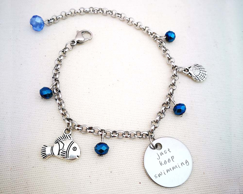 Under the sea - Infondo al mar Braccialetto a tema Disney con medaglietta in acciaio stampato Catena centrale in acciaio anallergico (non ossida ed è resistente agli agenti aggressivi, perciò può essere indossata sempre) Chiusura regolabile con moschettone in acciaio Ciondoli in rame placcato, nickel free (non consiglio di metterli a contatto con prodotti troppo aggressivi: detersivi, profumi, saponi, acqua di mare o acqua della piscina perchè, a lungo andare, potrebbero scalfirne l'argentatura) Perline in cristallo Spedita in un sacchino di organza con cartellino dedicato MATERIALI: catena centrale in acciaio chiusura regolabile con moschettone in acciaio medaglietta in acciaio con frase stampata a tema ciondoli in rame placcato nickel free perline in cristallo