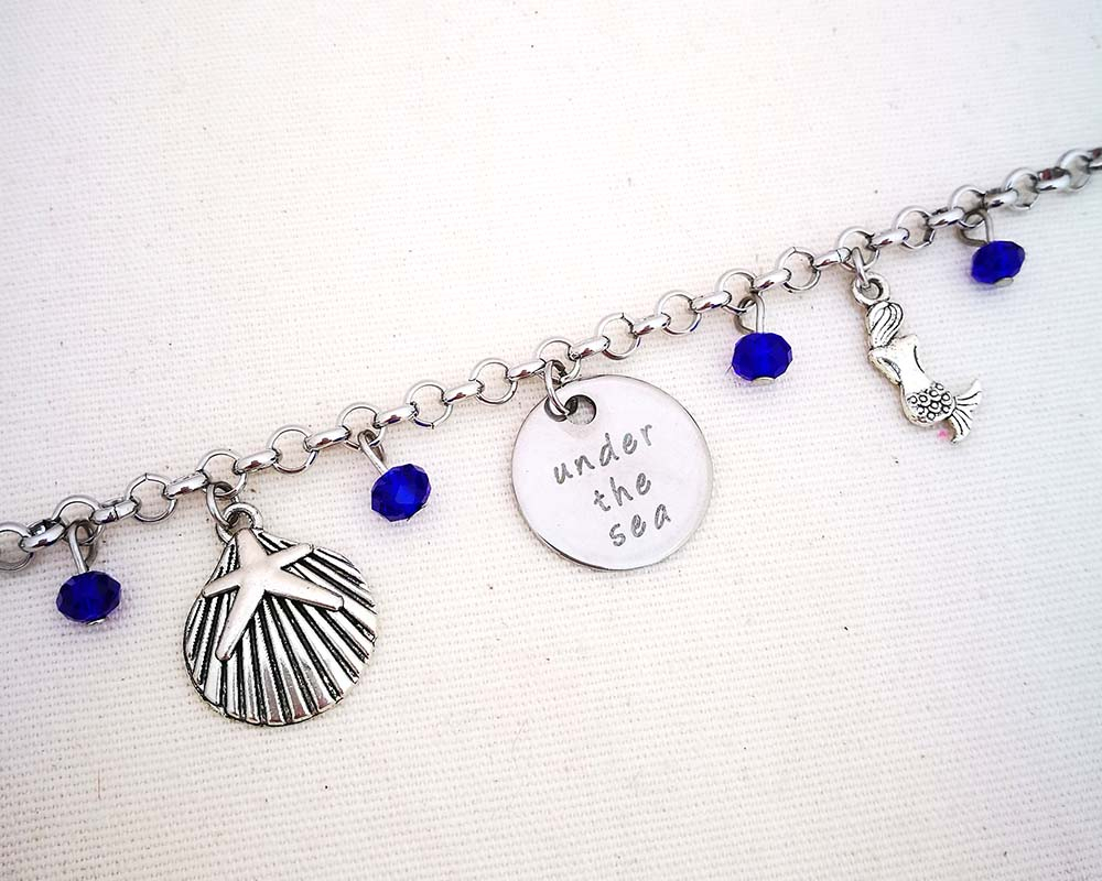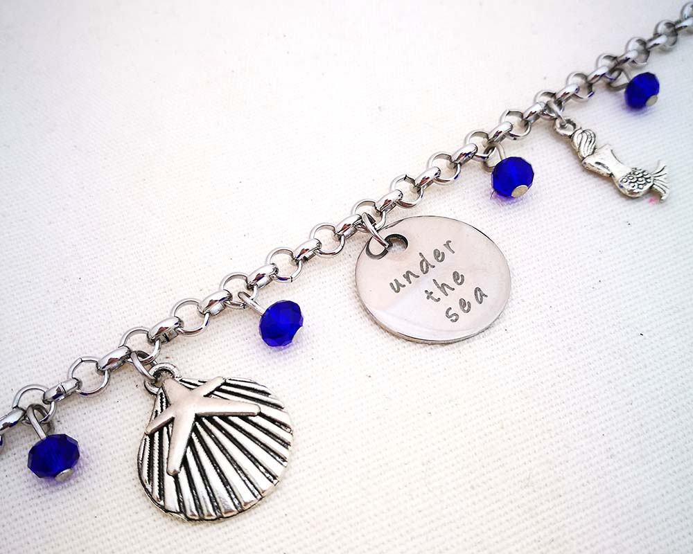 Under the sea - Infondo al Mar Collana a tema Disney con medaglietta in acciaio stampato Catenina in acciaio anallergico lunghezza media (68 cm) Chiusura fissa con moschettone a semino Ciondoli in rame placcato, nickel free Perlina colorata in cristallo Spedita nel suo sacchettino in organza con cartellino dedicato MATERIALI: catenina in acciaio mezza misura. L'acciaio non ossida ed è resistente agli agenti aggressivi perciò può essere indossato sempre chiusura fissa con moschettone medaglietta in acciaio con frase stampata a tema ciondoli in rame placcato nickel free. Non consiglio di metterli a contatto con prodotti troppo aggressivi: detersivi, profumi, saponi, acqua di mare o acqua della piscina perchè, a lungo andare, potrebbero scalfirne l'argentatura perlina in cristallo