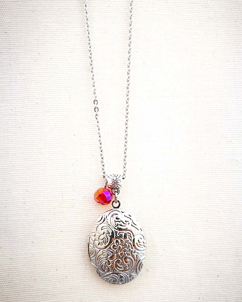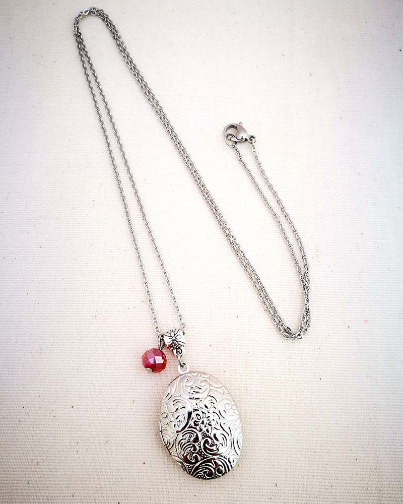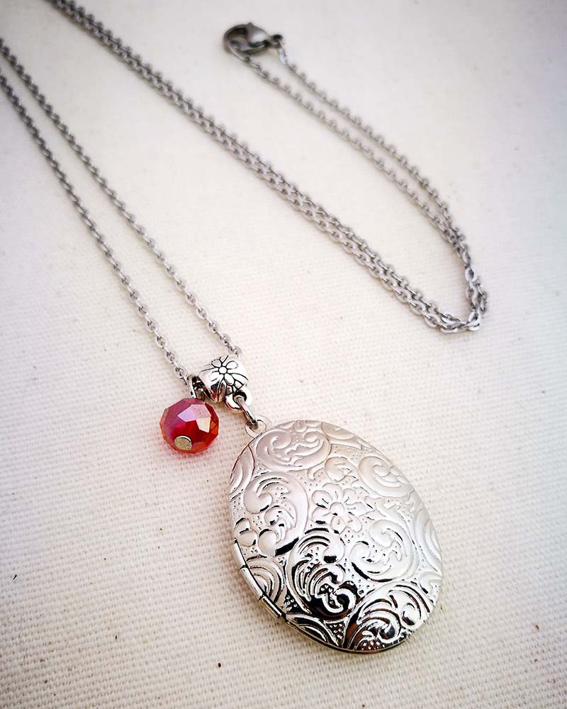Collana con pendente apribile portafoto. La catenina è in acciaio anallergico, non regolabile, misura medio lunga. Rifinita con una perlina pendente in cristallo colorato. Il pendente è lavorato con un intaglio fiorato, si apre a conchiglia e all'interno si può mettere una foto. Viene spedito con un messaggio scelto a caso fra quelli proposti qui sotto. Se volete un messagio specifico lo potete segnalare in fase d'ordine lasciando un commento oppure contattandomi. Se, invece, vuoi inserire una foto, scrivimi pure e ti saprò aiutare. Messaggi segreti: (Se ne vuoi uno in particolare scrivilo in fase d'ordine oppure contattami, altrimenti verrà scelto a caso in base alla disponibilità) - Sei tutti i limiti che superi - Oggi amati un pò di più - Vivi con passione, ridi di cuore, ama profondamente - Sogna la vita a colori - Non restare mai dove non riesci a fiorire - é tutto dentro di te, non smettere di cercare - Ricordati di essere felice - La vita è questa: niente è facile e nulla è impossibile - Se vuoi volare rinuncia a tutto ciò che ti pesa - Abbi cura di splendere - Fai un dispetto alla tristezza: sorridi MATERIALI catenina in acciaio anallergico, lunghezza 70 cm chiusura fissa, non regolabile, con moschettone a semino perlina in cristallo colorato ciondolo a cuore apribile in argento tibetano nickel free dimensione 2,5 cm