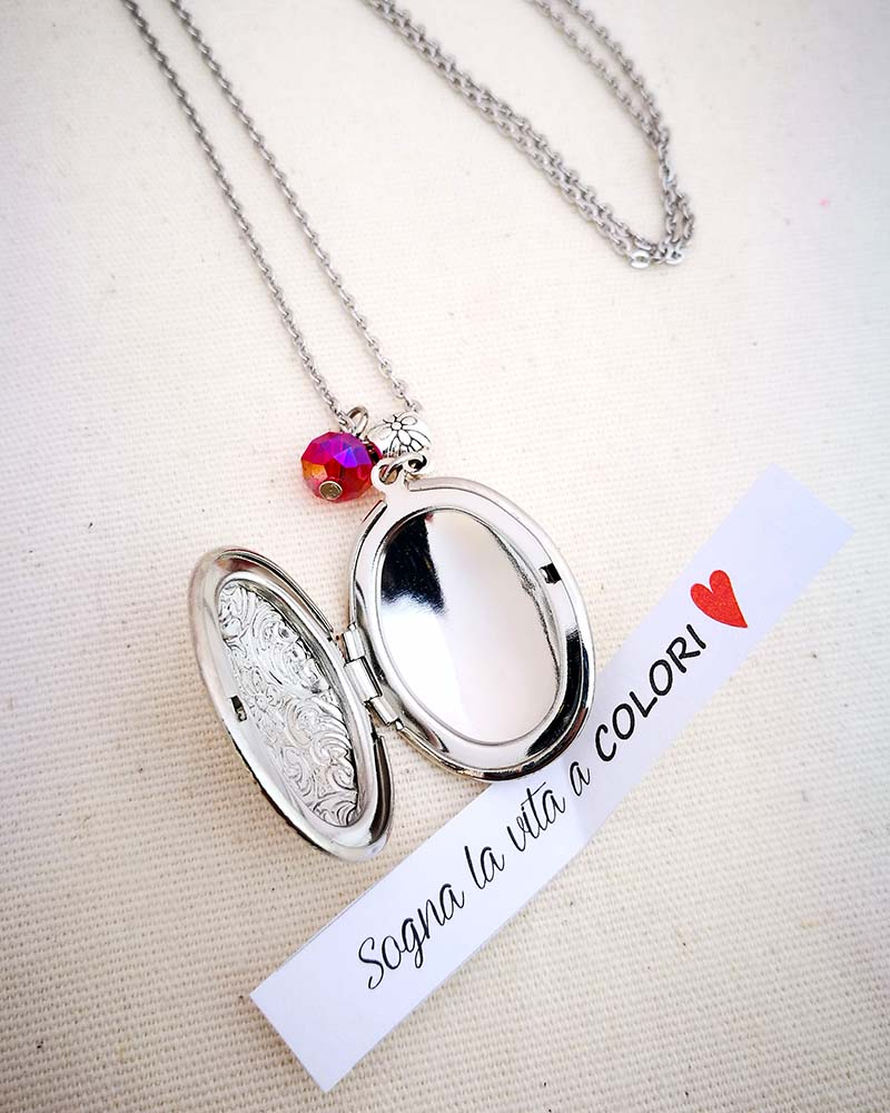 Collana con pendente apribile portafoto. La catenina è in acciaio anallergico, non regolabile, misura medio lunga. Rifinita con una perlina pendente in cristallo colorato. Il pendente è lavorato con un motivo a fiori intagliato, si può aprire e all'interno si può mettere una foto. Viene spedito con un messaggio scelto a caso fra quelli proposti qui sotto. Se volete un messagio specifico lo potete segnalare in fase d'ordine lasciando un commento oppure contattandomi. Se, invece, vuoi inserire una foto, scrivimi pure e ti saprò aiutare. Messaggi segreti: (Se ne vuoi uno in particolare scrivilo in fase d'ordine oppure contattami, altrimenti verrà scelto a caso in base alla disponibilità) - Sei tutti i limiti che superi - Oggi amati un pò di più - Vivi con passione, ridi di cuore, ama profondamente - Sogna la vita a colori - Non restare mai dove non riesci a fiorire - é tutto dentro di te, non smettere di cercare - Ricordati di essere felice - La vita è questa: niente è facile e nulla è impossibile - Se vuoi volare rinuncia a tutto ciò che ti pesa - Abbi cura di splendere - Fai un dispetto alla tristezza: sorridi MATERIALI catenina in acciaio anallergico, lunghezza 70 cm chiusura fissa, non regolabile, con moschettone a semino perlina in cristallo colorato ciondolo a cuore apribile in argento tibetano nickel free dimensioni 4 cm
