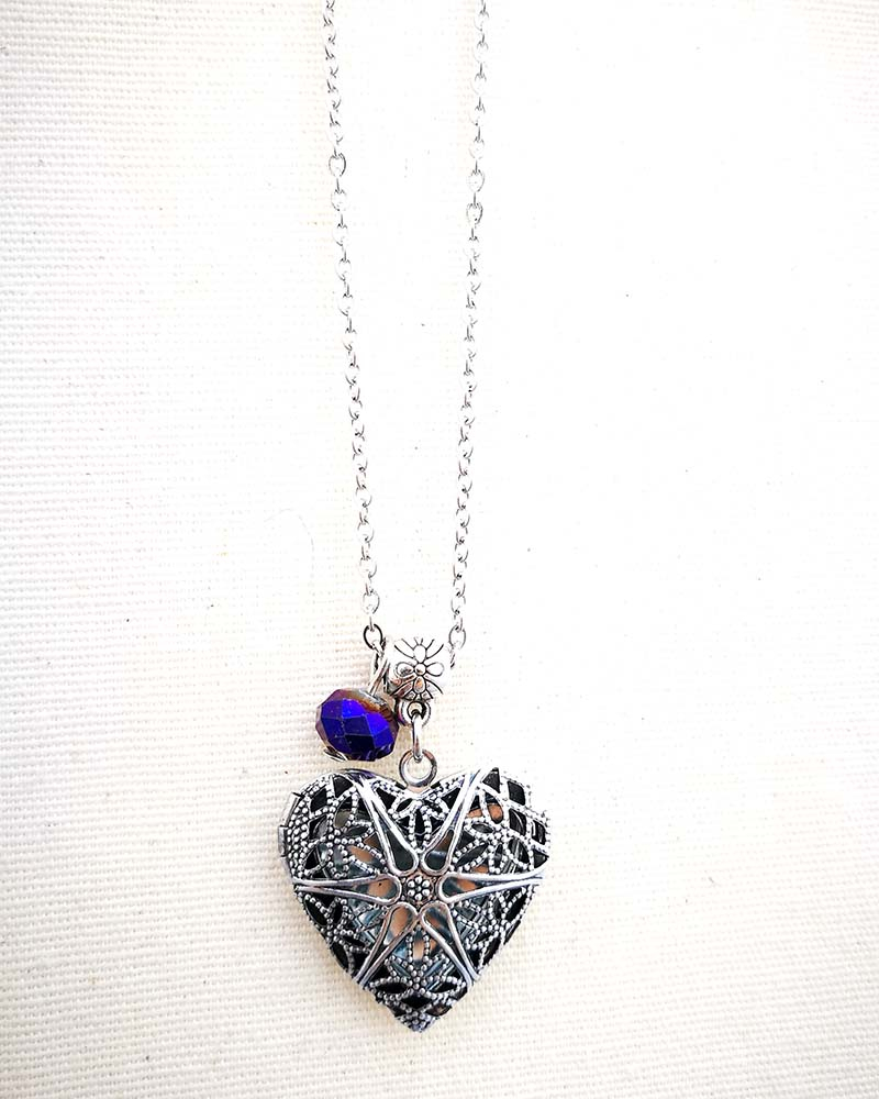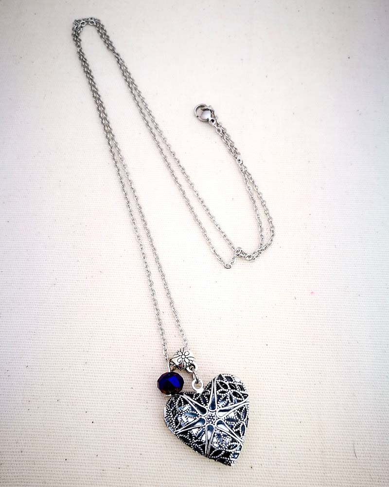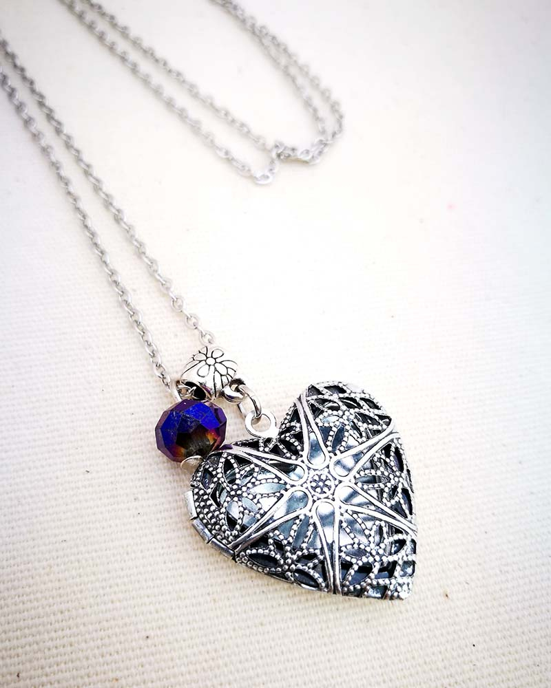 Collana con pendente apribile portafoto. La catenina è in acciaio anallergico, non regolabile, misura medio lunga. Rifinita con una perlina pendente in cristallo colorato. Il pendente è lavorato con un intaglio fiorato, si apre a conchiglia e all'interno si può mettere una foto. Viene spedito con un messaggio scelto a caso fra quelli proposti qui sotto. Se volete un messagio specifico lo potete segnalare in fase d'ordine lasciando un commento oppure contattandomi. Se, invece, vuoi inserire una foto, scrivimi pure e ti saprò aiutare. Messaggi segreti: (Se ne vuoi uno in particolare scrivilo in fase d'ordine oppure contattami, altrimenti verrà scelto a caso in base alla disponibilità) - Sei tutti i limiti che superi - Oggi amati un pò di più - Vivi con passione, ridi di cuore, ama profondamente - Sogna la vita a colori - Non restare mai dove non riesci a fiorire - é tutto dentro di te, non smettere di cercare - Ricordati di essere felice - La vita è questa: niente è facile e nulla è impossibile - Se vuoi volare rinuncia a tutto ciò che ti pesa - Abbi cura di splendere - Fai un dispetto alla tristezza: sorridi MATERIALI catenina in acciaio anallergico, lunghezza 70 cm chiusura fissa, non regolabile, con moschettone a semino perlina in cristallo colorato ciondolo a cuore apribile in argento tibetano nickel free dimensione 2,5 cm