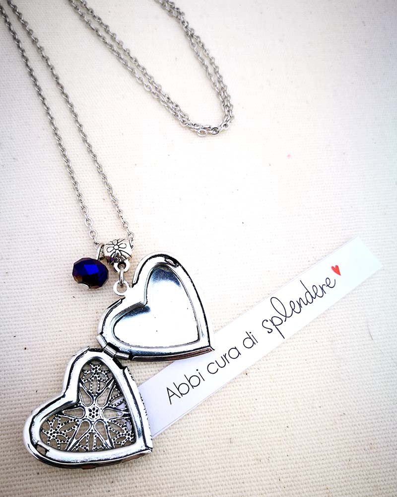 Collana con pendente apribile portafoto. La catenina è in acciaio anallergico, non regolabile, misura medio lunga. Rifinita con una perlina pendente in cristallo colorato. Il pendente è lavorato con un motivo a fiori intagliato, si può aprire e all'interno si può mettere una foto. Viene spedito con un messaggio scelto a caso fra quelli proposti qui sotto. Se volete un messagio specifico lo potete segnalare in fase d'ordine lasciando un commento oppure contattandomi. Se, invece, vuoi inserire una foto, scrivimi pure e ti saprò aiutare. Messaggi segreti: (Se ne vuoi uno in particolare scrivilo in fase d'ordine oppure contattami, altrimenti verrà scelto a caso in base alla disponibilità) - Sei tutti i limiti che superi - Oggi amati un pò di più - Vivi con passione, ridi di cuore, ama profondamente - Sogna la vita a colori - Non restare mai dove non riesci a fiorire - é tutto dentro di te, non smettere di cercare - Ricordati di essere felice - La vita è questa: niente è facile e nulla è impossibile - Se vuoi volare rinuncia a tutto ciò che ti pesa - Abbi cura di splendere - Fai un dispetto alla tristezza: sorridi MATERIALI catenina in acciaio anallergico, lunghezza 70 cm chiusura fissa, non regolabile, con moschettone a semino perlina in cristallo colorato ciondolo a cuore apribile in argento tibetano nickel free dimensioni 4 cm