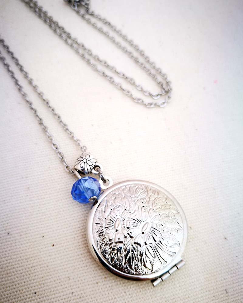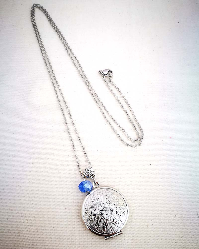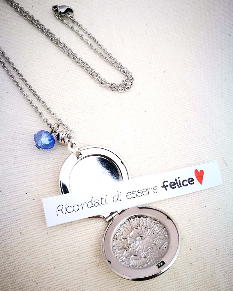 Collana con pendente apribile portafoto. La catenina è in acciaio anallergico, non regolabile, misura medio lunga. Rifinita con una perlina pendente in cristallo colorato. Il pendente è lavorato con un motivo a fiori intagliato, si può aprire e all'interno si può mettere una foto. Viene spedito con un messaggio scelto a caso fra quelli proposti qui sotto. Se volete un messagio specifico lo potete segnalare in fase d'ordine lasciando un commento oppure contattandomi. Se, invece, vuoi inserire una foto, scrivimi pure e ti saprò aiutare. Messaggi segreti: (Se ne vuoi uno in particolare scrivilo in fase d'ordine oppure contattami, altrimenti verrà scelto a caso in base alla disponibilità) - Sei tutti i limiti che superi - Oggi amati un pò di più - Vivi con passione, ridi di cuore, ama profondamente - Sogna la vita a colori - Non restare mai dove non riesci a fiorire - é tutto dentro di te, non smettere di cercare - Ricordati di essere felice - La vita è questa: niente è facile e nulla è impossibile - Se vuoi volare rinuncia a tutto ciò che ti pesa - Abbi cura di splendere - Fai un dispetto alla tristezza: sorridi MATERIALI catenina in acciaio anallergico, lunghezza 70 cm chiusura fissa, non regolabile, con moschettone a semino perlina in cristallo colorato ciondolo a cuore apribile in argento tibetano nickel free dimensioni 4 cm
