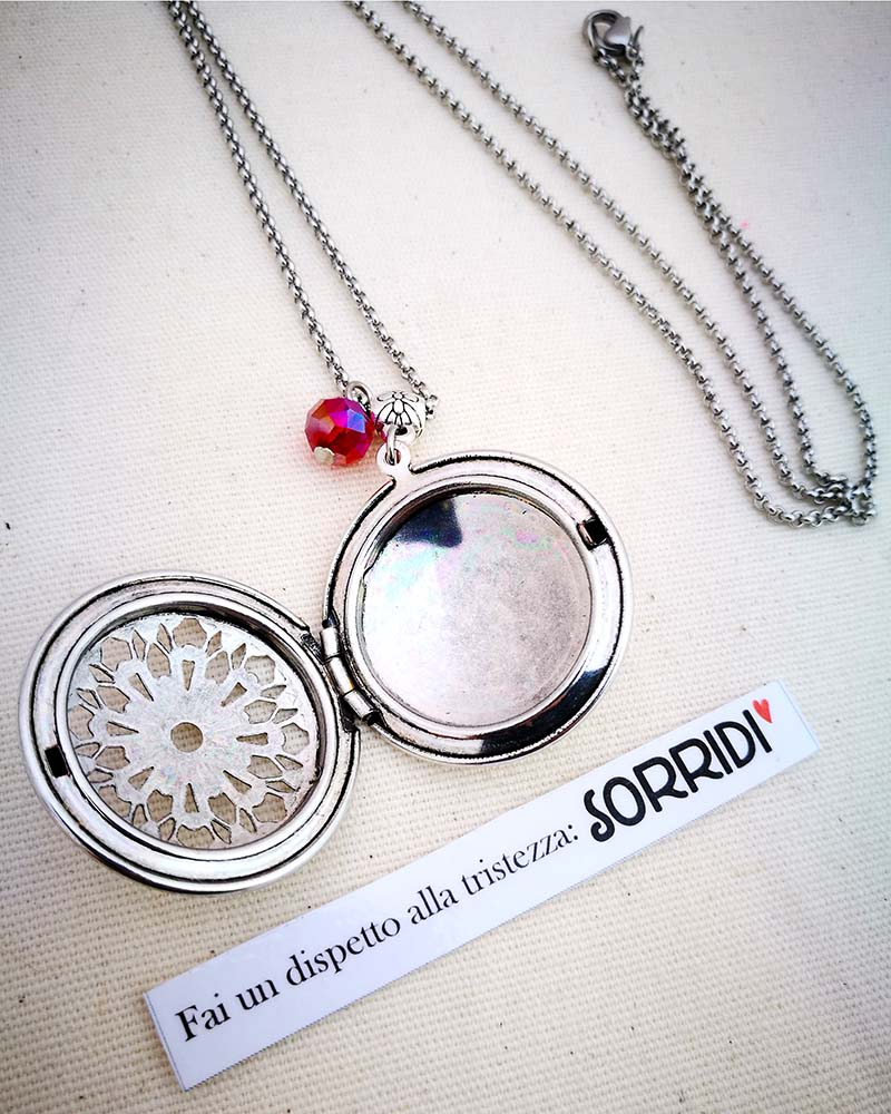 Collana con pendente apribile portafoto. La catenina è in acciaio anallergico, non regolabile, misura medio lunga. Rifinita con una perlina pendente in cristallo colorato. Il pendente è lavorato con un motivo a fiori intagliato, si può aprire e all'interno si può mettere una foto. Viene spedito con un messaggio scelto a caso fra quelli proposti qui sotto. Se volete un messagio specifico lo potete segnalare in fase d'ordine lasciando un commento oppure contattandomi. Se, invece, vuoi inserire una foto, scrivimi pure e ti saprò aiutare. Messaggi segreti: (Se ne vuoi uno in particolare scrivilo in fase d'ordine oppure contattami, altrimenti verrà scelto a caso in base alla disponibilità) - Sei tutti i limiti che superi - Oggi amati un pò di più - Vivi con passione, ridi di cuore, ama profondamente - Sogna la vita a colori - Non restare mai dove non riesci a fiorire - é tutto dentro di te, non smettere di cercare - Ricordati di essere felice - La vita è questa: niente è facile e nulla è impossibile - Se vuoi volare rinuncia a tutto ciò che ti pesa - Abbi cura di splendere - Fai un dispetto alla tristezza: sorridi MATERIALI catenina in acciaio anallergico, lunghezza 70 cm chiusura fissa, non regolabile, con moschettone a semino perlina in cristallo colorato ciondolo a cuore apribile in argento tibetano nickel free dimensioni 4 cm