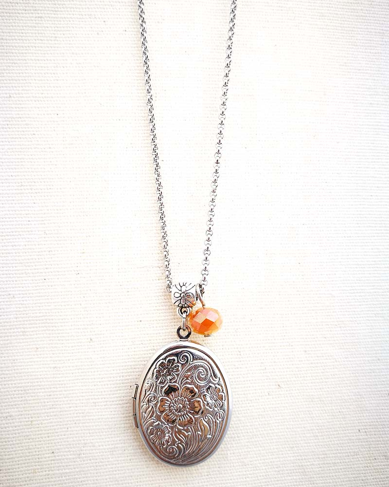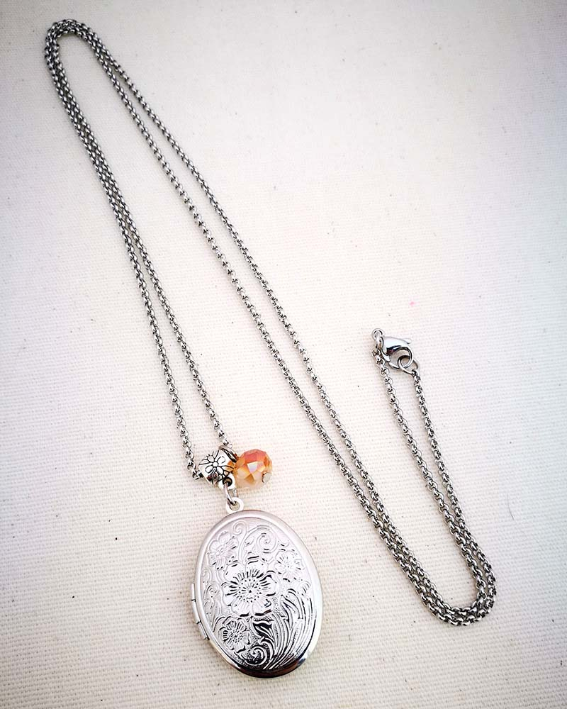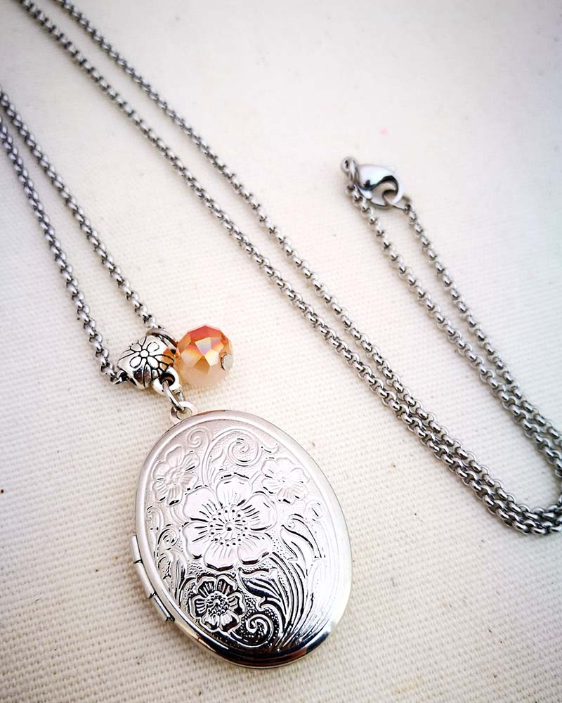 Collana con pendente apribile portafoto. La catenina è in acciaio anallergico, non regolabile, misura medio lunga. Rifinita con una perlina pendente in cristallo colorato. Il pendente è lavorato con un intaglio fiorato, si apre a conchiglia e all'interno si può mettere una foto. Viene spedito con un messaggio scelto a caso fra quelli proposti qui sotto. Se volete un messagio specifico lo potete segnalare in fase d'ordine lasciando un commento oppure contattandomi. Se, invece, vuoi inserire una foto, scrivimi pure e ti saprò aiutare. Messaggi segreti: (Se ne vuoi uno in particolare scrivilo in fase d'ordine oppure contattami, altrimenti verrà scelto a caso in base alla disponibilità) - Sei tutti i limiti che superi - Oggi amati un pò di più - Vivi con passione, ridi di cuore, ama profondamente - Sogna la vita a colori - Non restare mai dove non riesci a fiorire - é tutto dentro di te, non smettere di cercare - Ricordati di essere felice - La vita è questa: niente è facile e nulla è impossibile - Se vuoi volare rinuncia a tutto ciò che ti pesa - Abbi cura di splendere - Fai un dispetto alla tristezza: sorridi MATERIALI catenina in acciaio anallergico, lunghezza 70 cm chiusura fissa, non regolabile, con moschettone a semino perlina in cristallo colorato ciondolo a cuore apribile in argento tibetano nickel free dimensione 2,5 cm