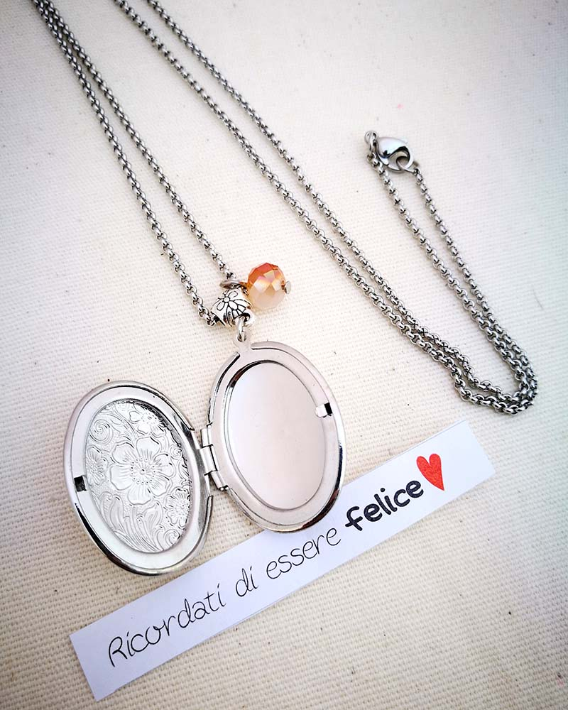 Collana con pendente apribile portafoto. La catenina è in acciaio anallergico, non regolabile, misura medio lunga. Rifinita con una perlina pendente in cristallo colorato. Il pendente è lavorato con un motivo a fiori intagliato, si può aprire e all'interno si può mettere una foto. Viene spedito con un messaggio scelto a caso fra quelli proposti qui sotto. Se volete un messagio specifico lo potete segnalare in fase d'ordine lasciando un commento oppure contattandomi. Se, invece, vuoi inserire una foto, scrivimi pure e ti saprò aiutare. Messaggi segreti: (Se ne vuoi uno in particolare scrivilo in fase d'ordine oppure contattami, altrimenti verrà scelto a caso in base alla disponibilità) - Sei tutti i limiti che superi - Oggi amati un pò di più - Vivi con passione, ridi di cuore, ama profondamente - Sogna la vita a colori - Non restare mai dove non riesci a fiorire - é tutto dentro di te, non smettere di cercare - Ricordati di essere felice - La vita è questa: niente è facile e nulla è impossibile - Se vuoi volare rinuncia a tutto ciò che ti pesa - Abbi cura di splendere - Fai un dispetto alla tristezza: sorridi MATERIALI catenina in acciaio anallergico, lunghezza 70 cm chiusura fissa, non regolabile, con moschettone a semino perlina in cristallo colorato ciondolo a cuore apribile in argento tibetano nickel free dimensioni 4 cm