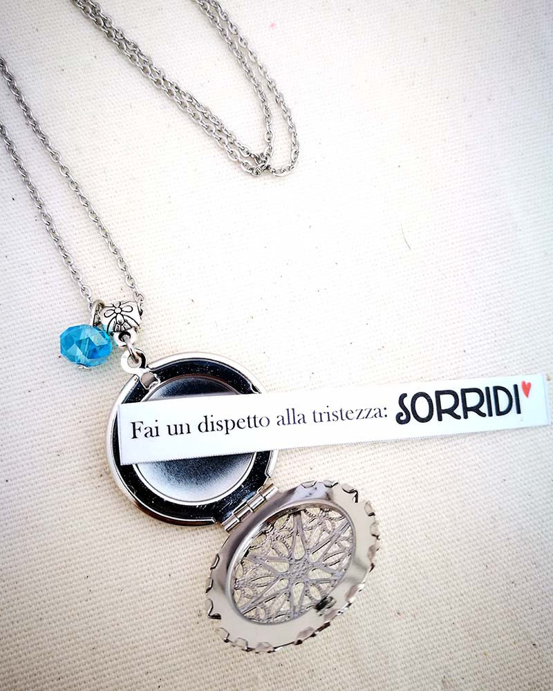 Collana con pendente apribile portafoto. La catenina è in acciaio anallergico, non regolabile, misura medio lunga. Rifinita con una perlina pendente in cristallo colorato. Il pendente è lavorato con un motivo a fiori intagliato, si può aprire e all'interno si può mettere una foto. Viene spedito con un messaggio scelto a caso fra quelli proposti qui sotto. Se volete un messagio specifico lo potete segnalare in fase d'ordine lasciando un commento oppure contattandomi. Se, invece, vuoi inserire una foto, scrivimi pure e ti saprò aiutare. Messaggi segreti: (Se ne vuoi uno in particolare scrivilo in fase d'ordine oppure contattami, altrimenti verrà scelto a caso in base alla disponibilità) - Sei tutti i limiti che superi - Oggi amati un pò di più - Vivi con passione, ridi di cuore, ama profondamente - Sogna la vita a colori - Non restare mai dove non riesci a fiorire - é tutto dentro di te, non smettere di cercare - Ricordati di essere felice - La vita è questa: niente è facile e nulla è impossibile - Se vuoi volare rinuncia a tutto ciò che ti pesa - Abbi cura di splendere - Fai un dispetto alla tristezza: sorridi MATERIALI catenina in acciaio anallergico, lunghezza 70 cm chiusura fissa, non regolabile, con moschettone a semino perlina in cristallo colorato ciondolo a cuore apribile in argento tibetano nickel free dimensioni 4 cm